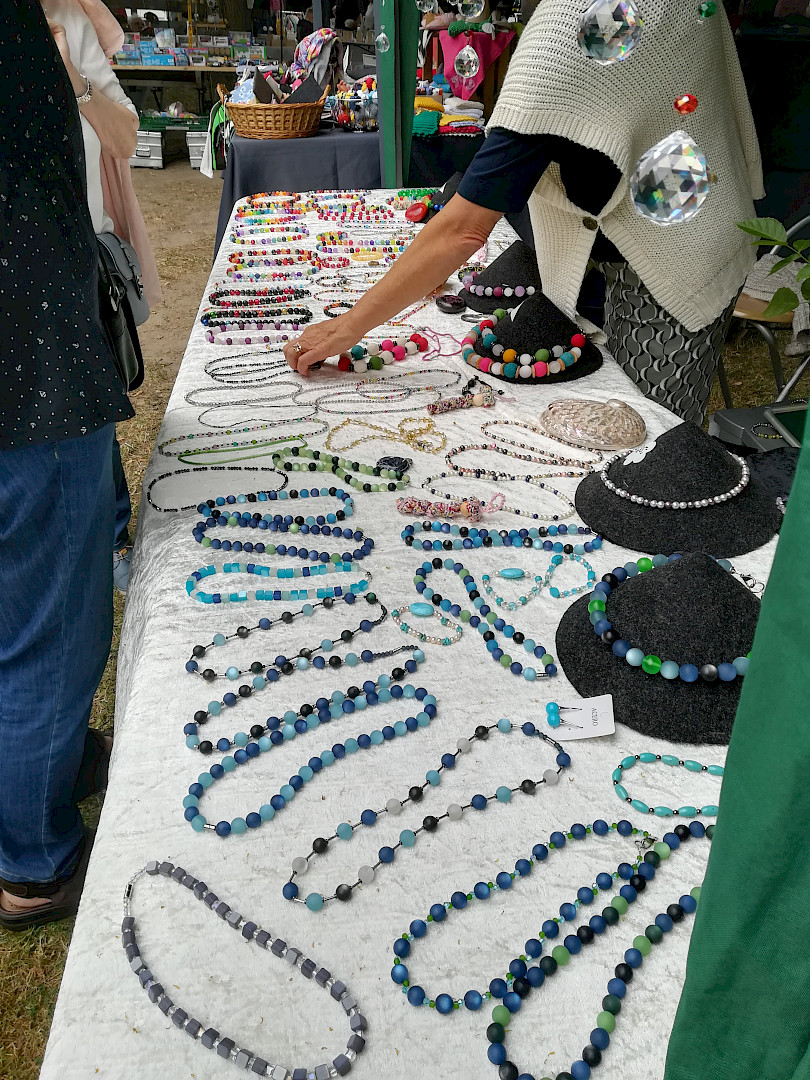 Der traditionsreiche Markt, der in diesem Jahr wieder kurz vor den Sommerferien stattfindet, lockt Besucher:innen aus dem gesamten Kreis Steinfurt und der Grafschaft Bentheim nach Wettringen. Rund 65 Aussteller:innen bieten eine große Auswahl hochwertiger kunsthandwerklicher Erzeugnisse. Die Auswahl reicht von Silberschmuck über Gestricktes und Genähtes bis hin zu Deko-Artikeln aus Holz, Beton und Harzoptik sowie Lederwaren und Lesezeichen. Gefilztes wird ebenfalls nicht fehlen.