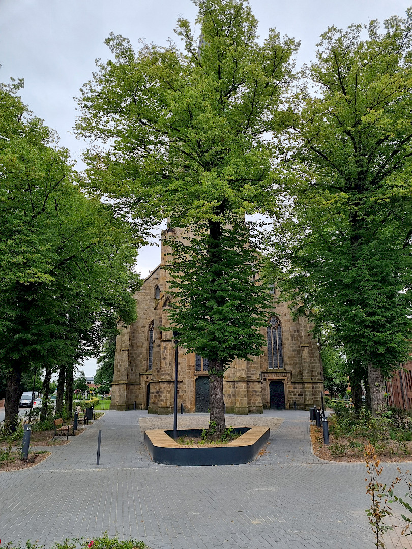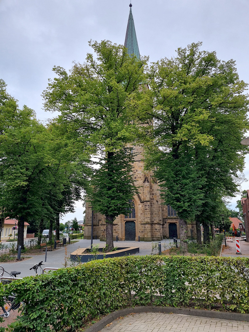 Die erste Holzkirche und Güter wurden 838 erstmals als Besitz des Klosters Herford erwähnt. Aus einer steinernen Vorgängerkirche aus dem 11. Jahrhundert, die 1862 abgerissen wurde, stammen einige künstlerisch wertvolle Ausstattungsstücke wie ein spätromanischer Taufstein und eine spätgotische Sakramentsnische. Das Langhaus mit seinen beiden Seitenschiffen wird von vier hohen Strebepfeilern dominiert. Schwere Bronzetüren zeigen Bilder aus dem Alten und Neuen Testament. Im Turmgiebel steht auf einer Konsole die Statue der heiligen Petronilla. Im Jahr 2012 wurde eine umfangreiche Renovierung abgeschlossen; die Kirche wirkt nun einladender und deutlich heller.